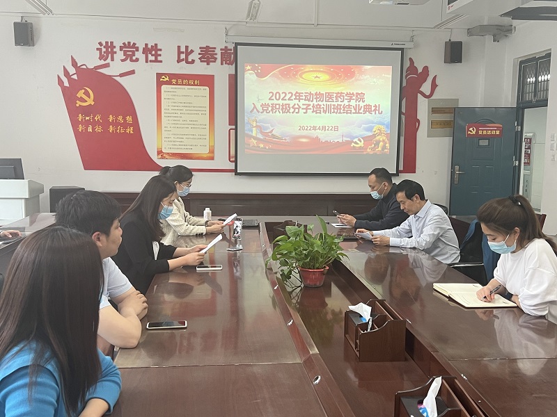 4月22日中午12:30,动物医药学院2022年第一期入党积极分子培训班结业典礼在善知楼C401举行。动物医药学院党委书记刘永录教授出席并讲话,院党委副书记汪洋、院团委副书记樊明明、聂丹及全体辅导员老师出席此次结业典礼。典礼由院团委副书记聂丹主持,全体入党积极分子通过腾讯会议参加了本次结业典礼。