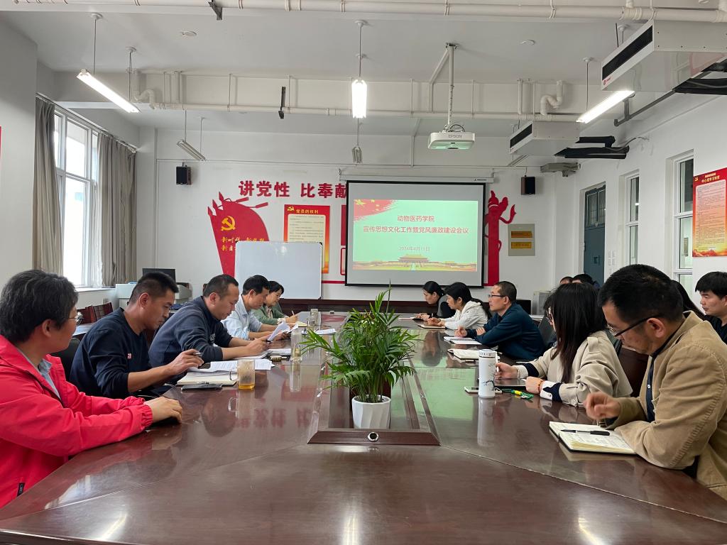 4月11日下午,动物医药学院在生工楼C401召开宣传思想文化工作暨党风廉政建设会议,深入学习学校宣传思想文化工作会议精神,学院党委书记刘永录、党委副书记汪洋、学院副院长李利红、学院副院长吴玉臣、全体科级干部、党支部书记及部分辅导员参会。