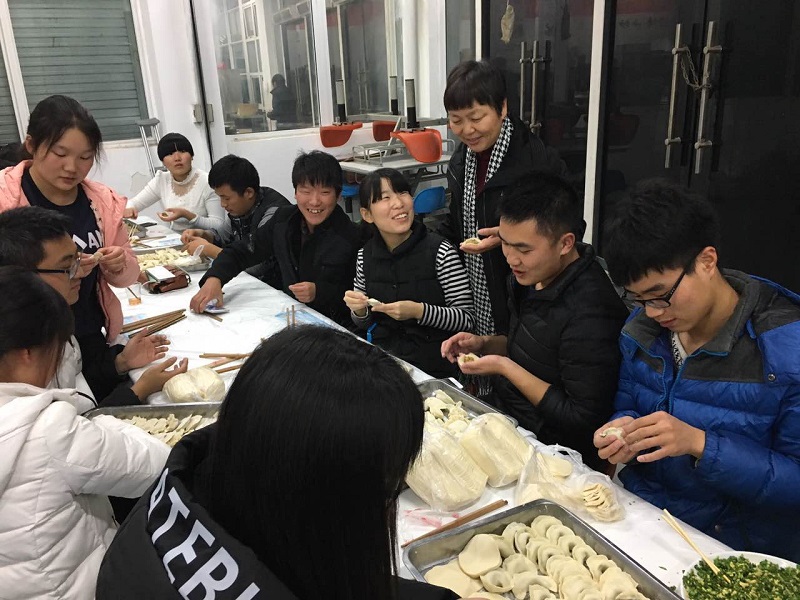 在现场,同学们有揉面的、有擀皮儿的、有包饺子的,但是也有同学在家里不常动手,操作生疏的,老师们耐心的教起了大家如何包饺子,师生齐聚,一团和气,领导和老师们来到包饺子的现场不仅为节日添加了一丝温暖,也让同学们的心里泛起了阵阵暖意,师生齐动手,也更让这次活动充满了家的感觉。虽然包出来的饺子千姿百态,但从学生们的脸上可以看出由衷的开心,吃着自己的劳动成果,这饺子才更有滋味。